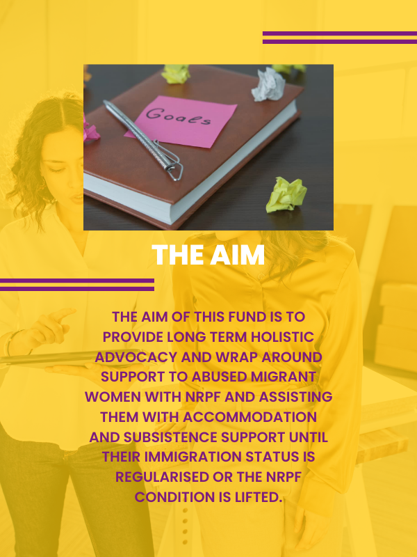 The aim of this fund is to provide long term holistic advocacy and wrap around support to abused migrant women with NRPF and assisting them with accommodation and subsistence support until their immigration status is regularised or the NRPF condition is lifted.