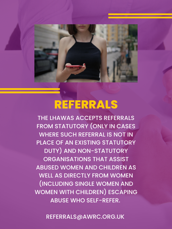 The LHAWAS accepts referrals from statutory (only in cases where such referral is not in place of an existing statutory duty) and non-statutory organisations that assist abused women and children as well as directly from women (including single women and women with children) escaping ABUSE who self-refer.