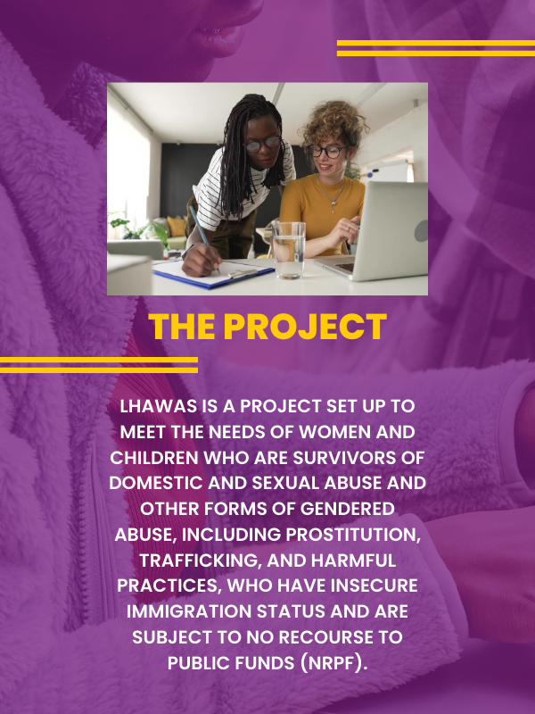 LHAWAS is a project set up to meet the needs of women and children who are survivors of domestic and sexual abuse and other forms of gendered abuse, including prostitution, trafficking, and harmful practices, who have insecure immigration status and are subject to no recourse to public funds (NRPF).