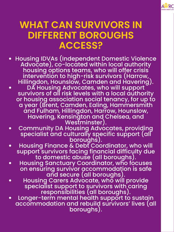 - Housing Carers Advocate, who will provide specialist support to survivors with caring responsibilities (all boroughs).