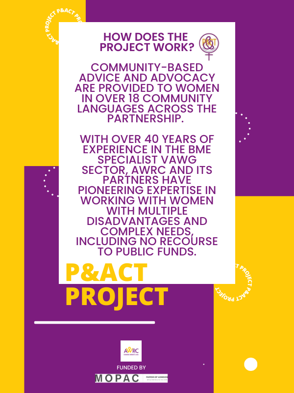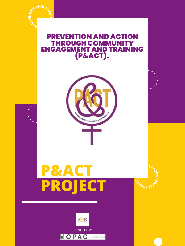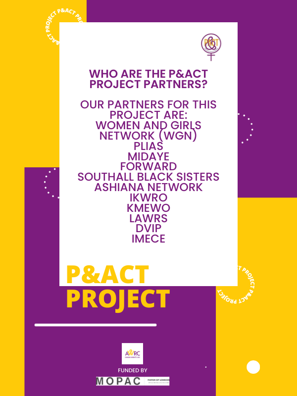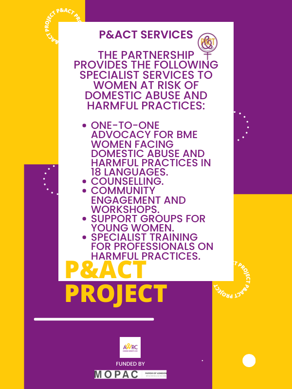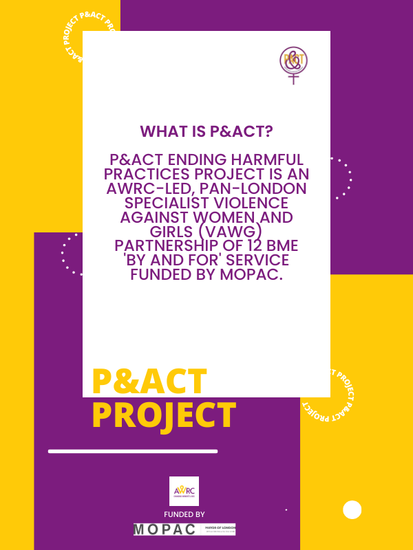P&ACT Ending Harmful Practices Project is an AWRC-led, pan-London specialist Violence Against Women and Girls (VAWG) Partnership of 12 BME 'by and for' service funded by MOPAC.