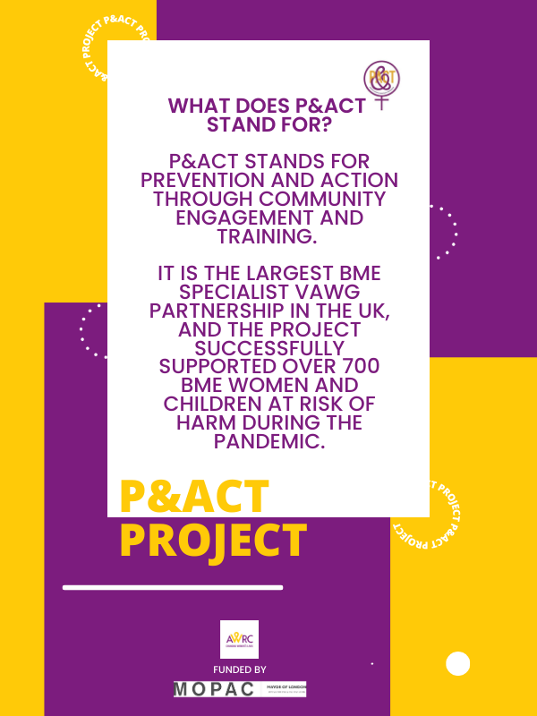 P&ACT stands for Prevention and Action through Community Engagement and Training. It is the largest BME specialist VAWG partnership in the UK, and the project successfully supported over 700 BME women and children at risk of harm during the pandemic.